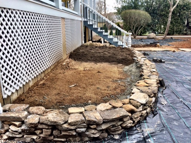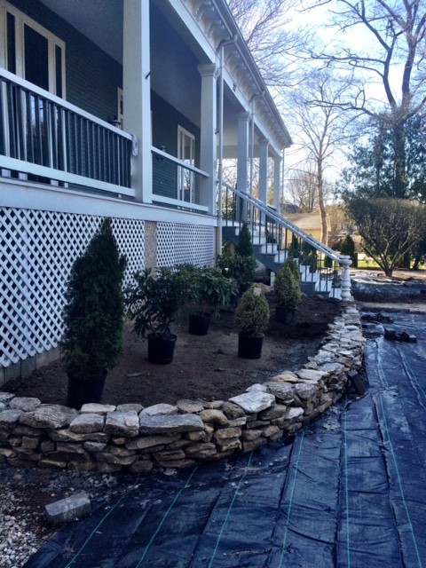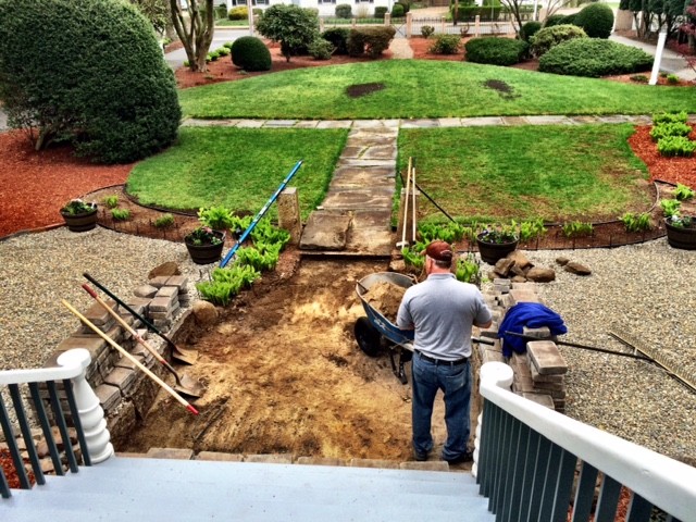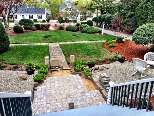 When the time came Kevin Sr and son Kevin Jr. got to work with hand tools and a bobcat to gut the garden. Next Kevin Sr. started by building new stone walls for the redesigned front gardens. New lattice was added as a backdrop for new shrubs and flowering plants. Another new addition were window boxes built by Kevin St. to hang on the lattice. Kevin Sr. then moved on to create a new paver front walk where the old marble tiles had cracked and were not replaceable as they were cemented into the ground.